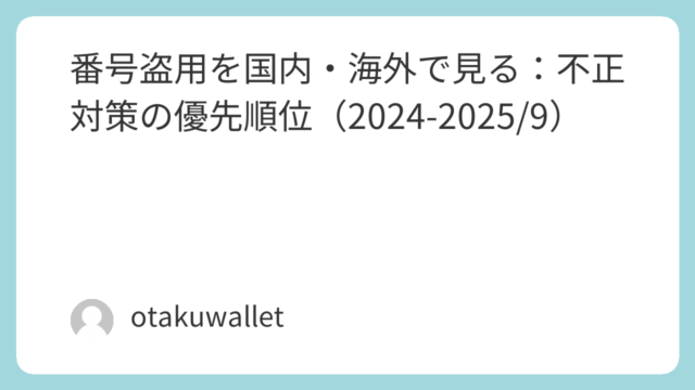 セキュリティ 番号盗用を国内・海外で見る:不正対策の優先順位(2024-2025/9) 番号盗用の統計を「国内・海外別内訳」で読み解き、対策の優先順位を整理。国内ECの守りと越境取引の制御を、更新不要な観点で解説します。 2026.01.23 セキュリティデータ